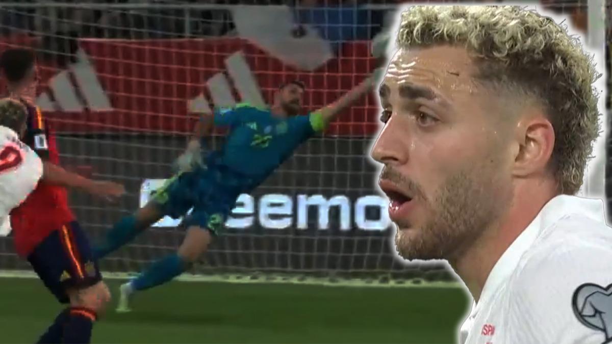 Galatasaray’ın ve milli takımın önemli golcülerinden Barış Alper Yılmaz, ölü topun üzerinden topu dışarı atmaya çalıştı. Yıldızın güçlü şutunu engellemekte zorlanan İspanyol kaleci Unai Simon, son dakikada golü engelledi.
